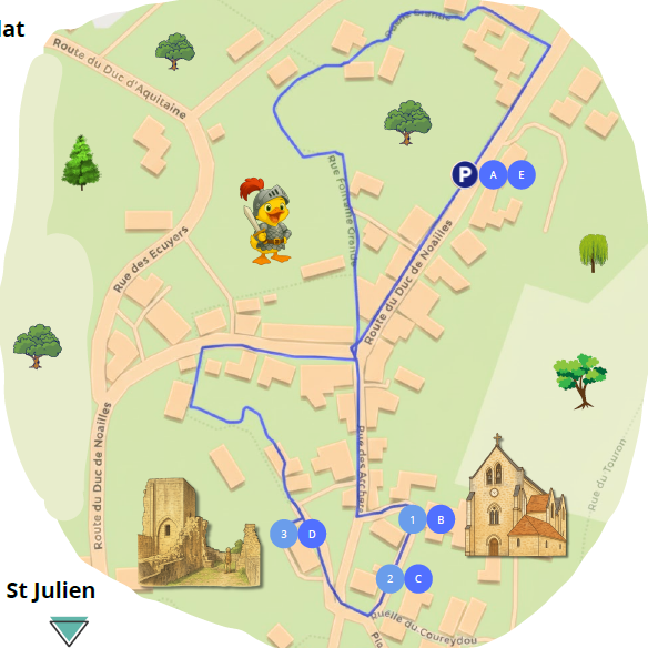 Suivez le parcours à travers le village, découvrez les lieux historiques et repérez facilement les lieux pratiques pour profiter pleinement de votre visite.