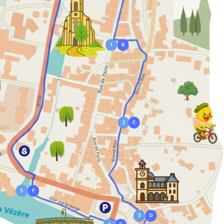 Suivez le parcours à travers le village, découvrez les lieux historiques et repérez facilement les lieux pratiques pour profiter pleinement de votre visite.