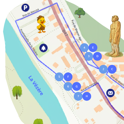 Suivez le parcours à travers le village, découvrez les lieux historiques et repérez facilement les lieux pratiques pour profiter pleinement de votre visite.