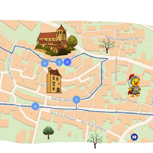 Suivez le parcours à travers le village, découvrez les lieux historiques et repérez facilement les lieux pratiques pour profiter pleinement de votre visite.