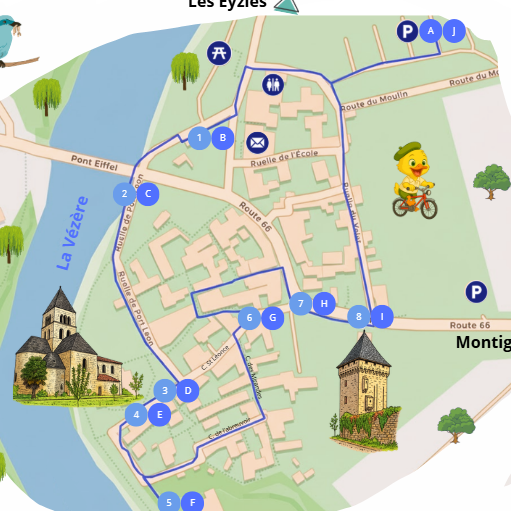 Suivez le parcours à travers le village, découvrez les lieux historiques et repérez facilement les lieux pratiques pour profiter pleinement de votre visite.