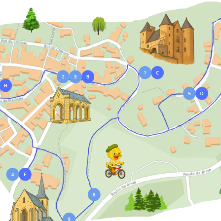 Suivez le parcours à travers le village, découvrez les lieux historiques et repérez facilement les lieux pratiques pour profiter pleinement de votre visite.